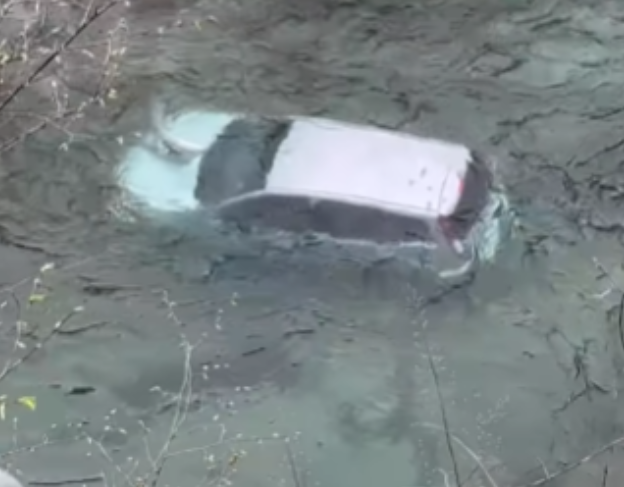 Фотографии и видеа што се шират на социјалните мрежи прикажуваат автомобил делумно потонат во реката, со видливи оштетувања.