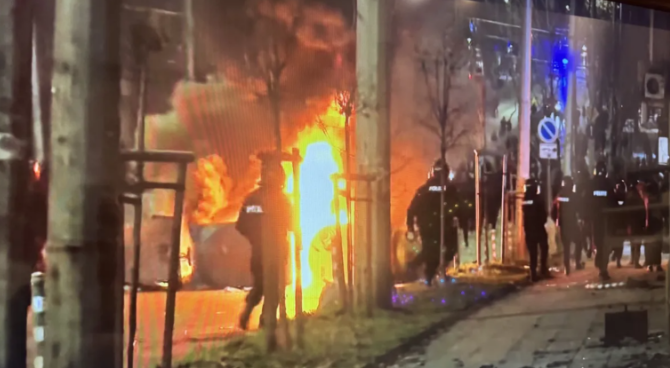 Демонстрантите со дуксери фрлаа колци, тенџериња и сообраќајни знаци, запалија канти за ѓубре и нападнаа полициско комбе. Полицијата употреби солзавец за да ја разбие толпата.