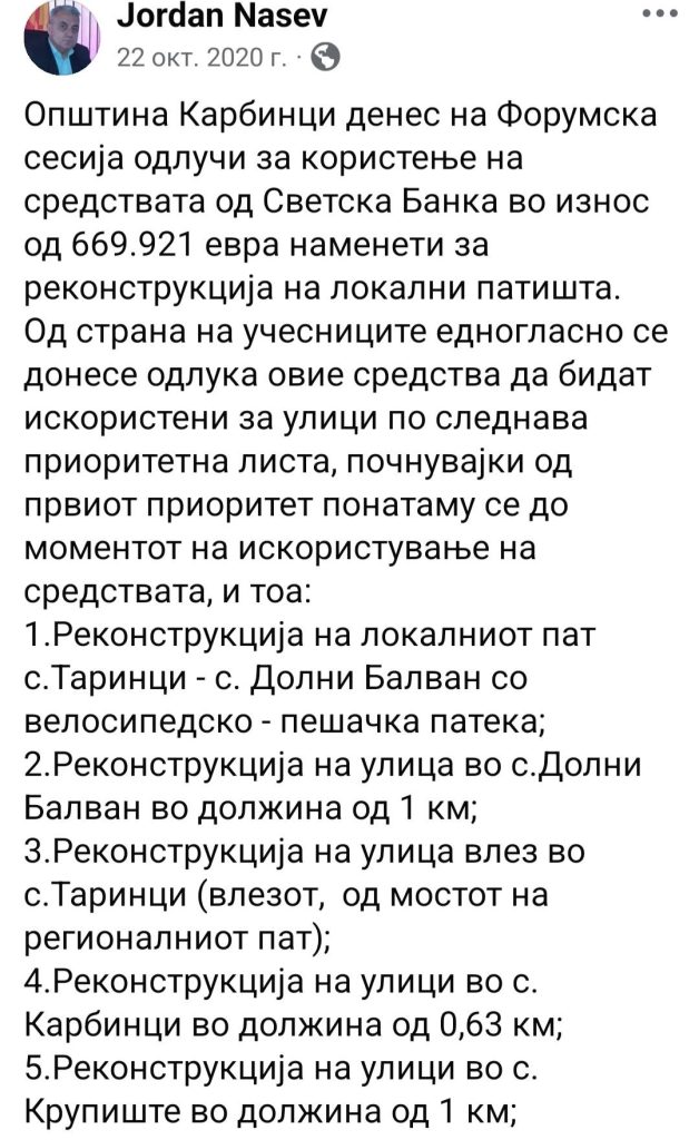 Овој проект беше изгласан со граѓанска иницијатива на форуми, а во 2020 година Владата предводена од СДСМ обезбеди 29,5 милиони денари преку Министерството за транспорт и врски за реконструкција на локалниот пат Таринци – Долни Балван.